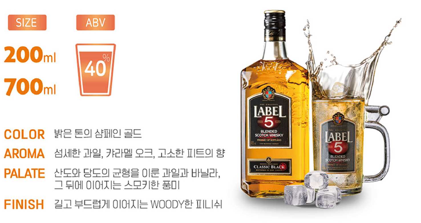 Label 5 Classic Black은 1969년부터 생산된 스카치 위스키입니다. 전 세계적으로 사랑받아온 스코틀랜드 스페이사이드 지역의 '글렌모레이' 증류소의 원액을 중 심으로 만들어지고 있습니다.